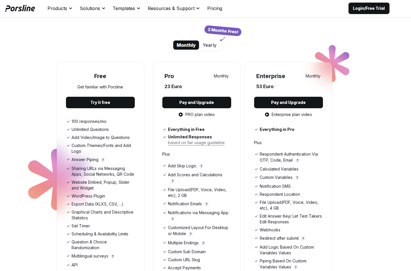 Porsline offers a straightforward pricing structure with an easy upgrade path. The Free plan includes the core survey features, while the Pro plan starts at €23 and unlocks unlimited responses, advanced logic, file uploads, and automated notifications.